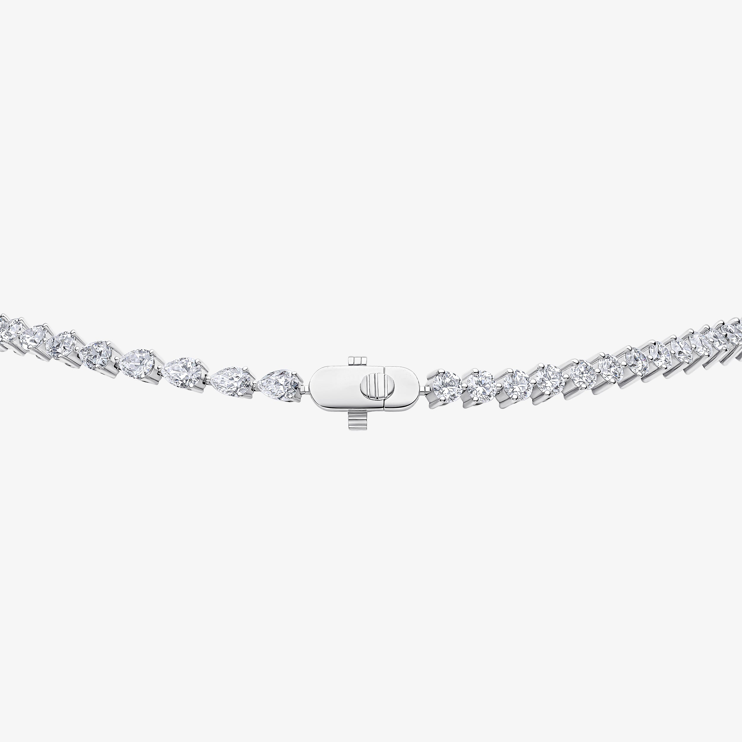 As worn by our Global Creative Director, Sarah Jessica Parker in her trademark asymmetric style, this show stopper of a necklace is made with the highest quality pear-cut diamonds wrapped around the neck and falling into a graduated tail of brilliant round lab diamonds.