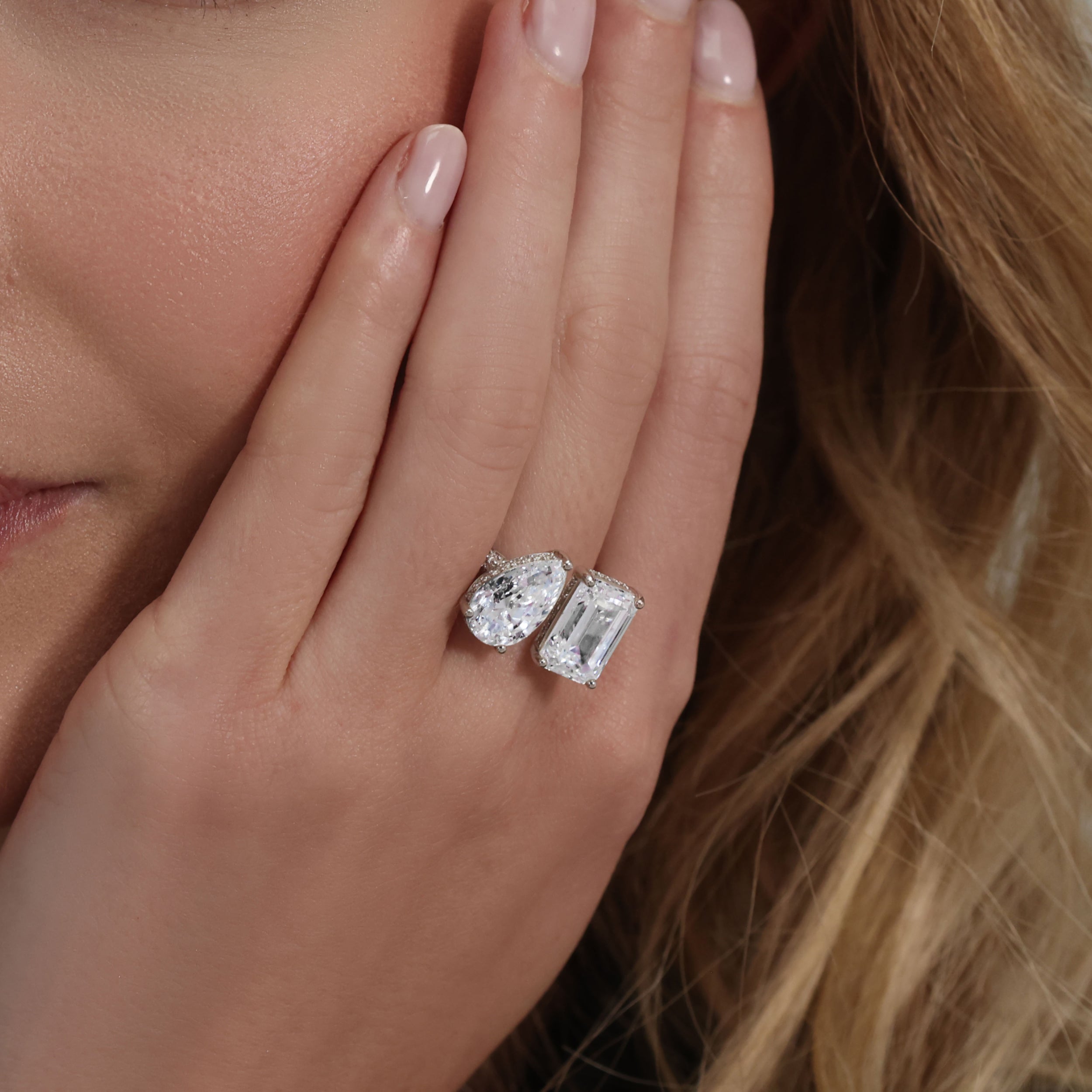 When you love two shapes and can't decide, get both! Our stunning pear and emerald cut diamond ring set in 18K Gold or Platinum with a sparkly pave encrusted band.
