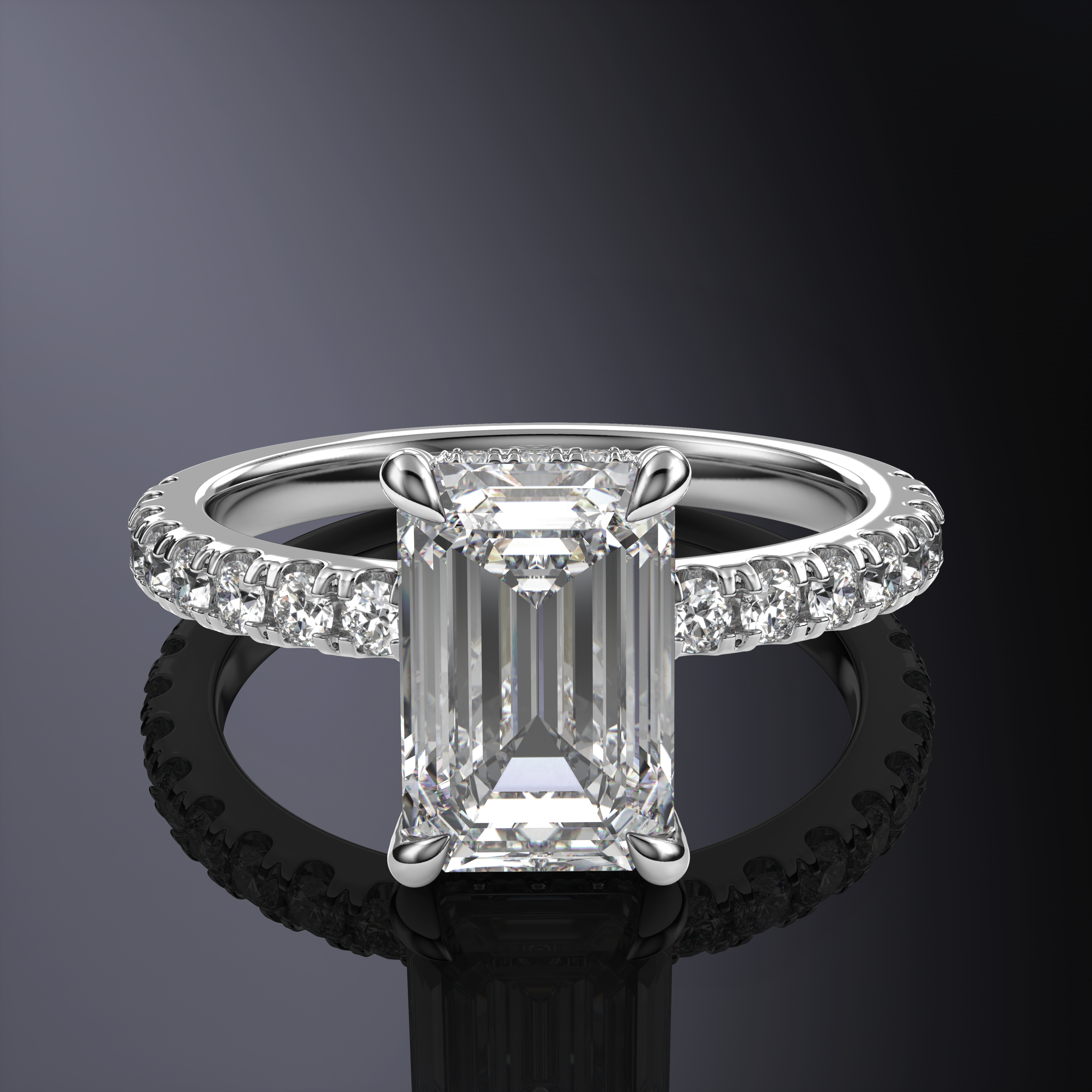 The Emerald Hidden Halo Ring with Pavé Band is a timeless design with a touch of modern brilliance. Featuring an emerald-cut lab-grown diamond, it is complemented by a hidden halo of pavé-set diamonds that add subtle sparkle. A single row of pavé diamonds along the band enhances its refined elegance, creating a sleek and sophisticated look. Available in platinum and 18K gold.