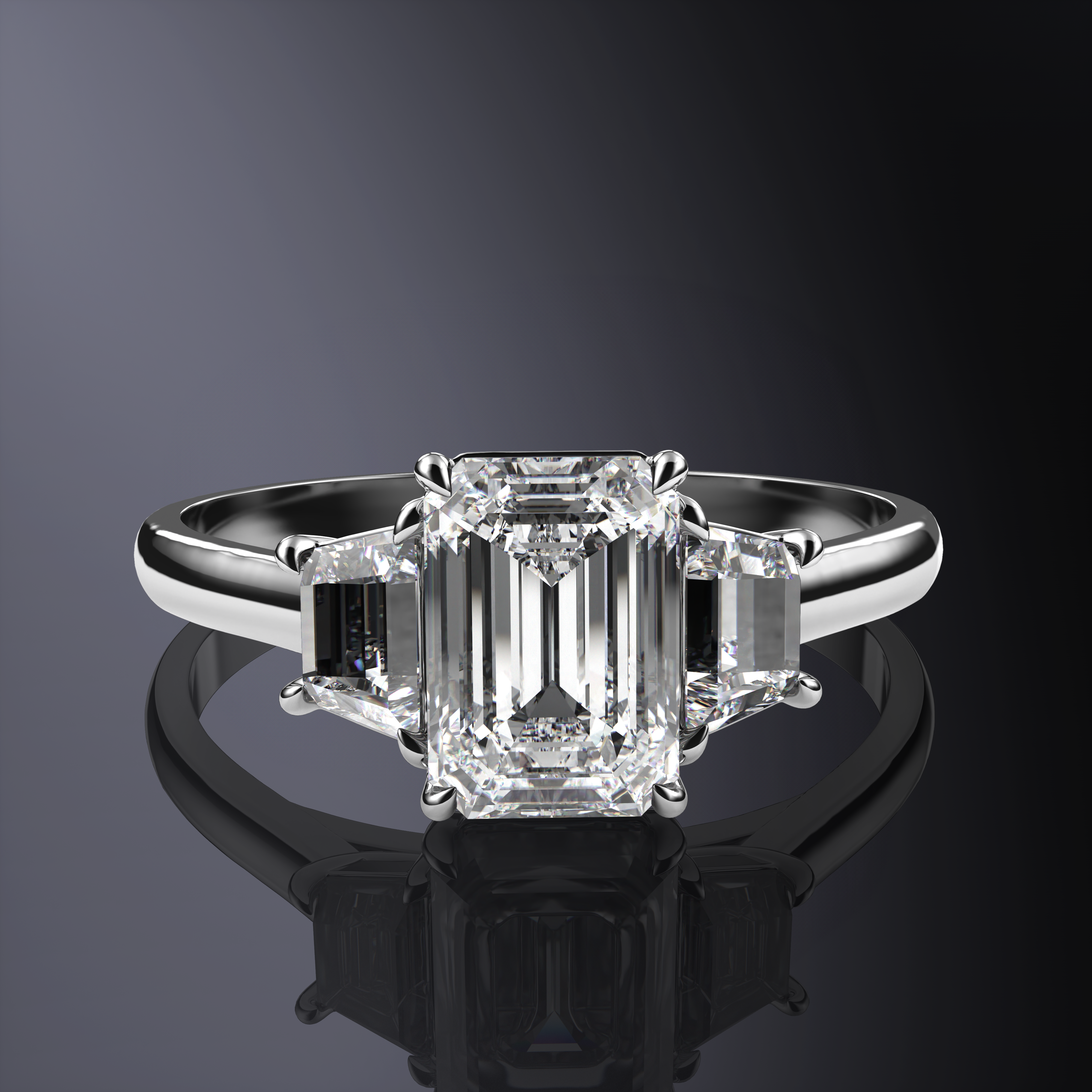 Astrea's Emerald engagement ring. A classic three-stone setting, featuring a beautiful emerald diamond positioned between two brilliant trapezoids and delicately supported by four claw prongs.