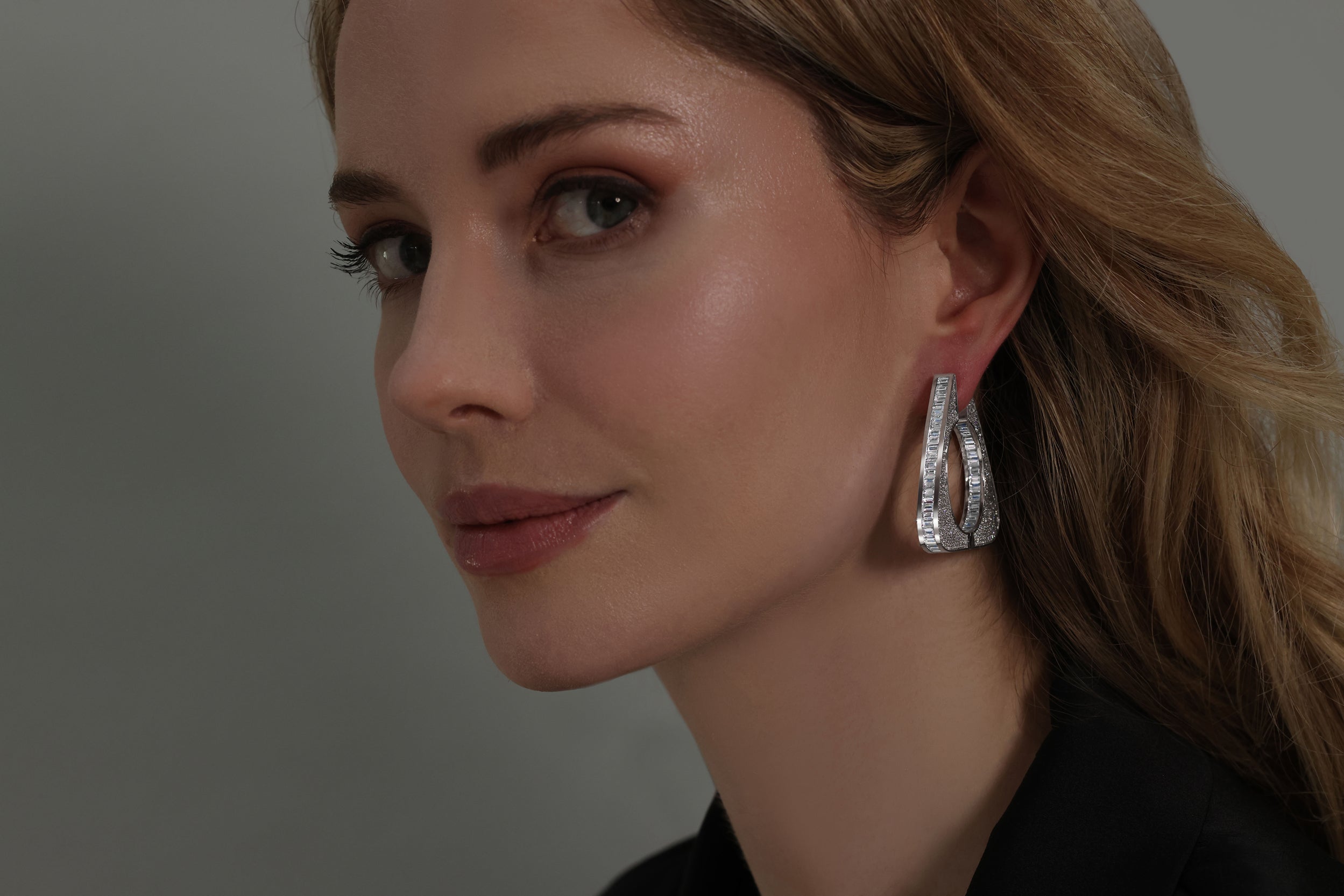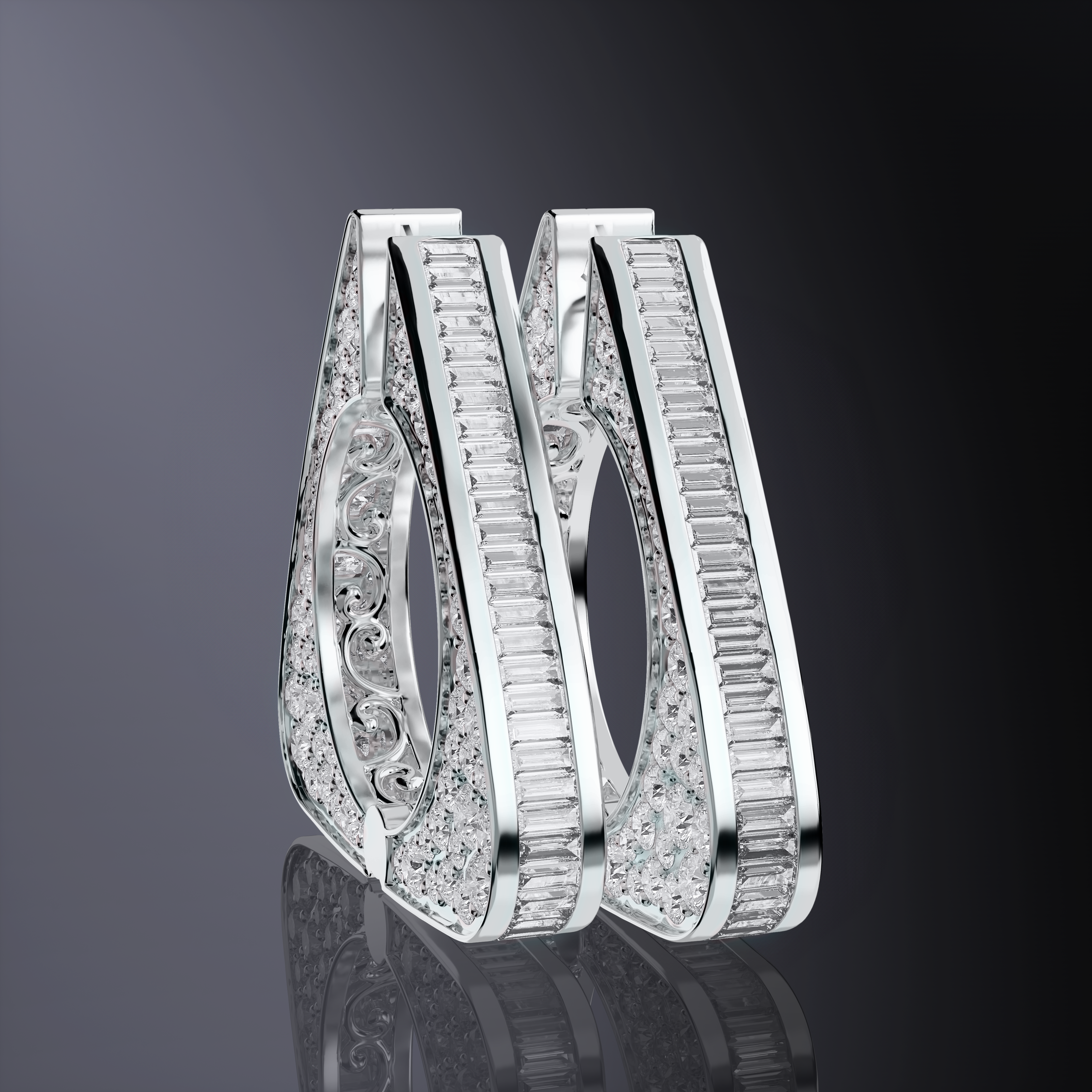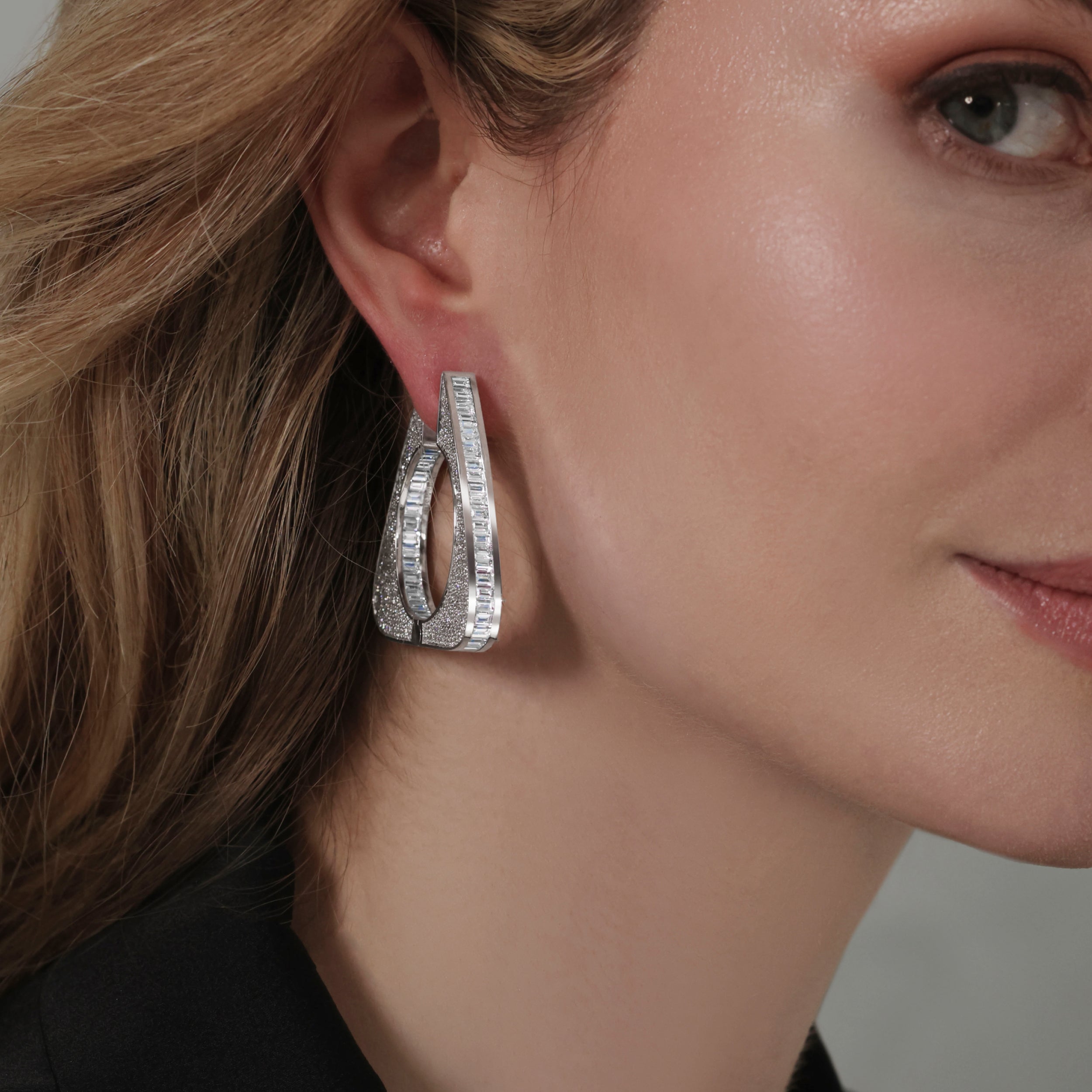 Encrusted with pave diamonds and lined with delicate baguette cut lab-grown diamonds, these earrings glisten in all directions, for that extra special sparkle.