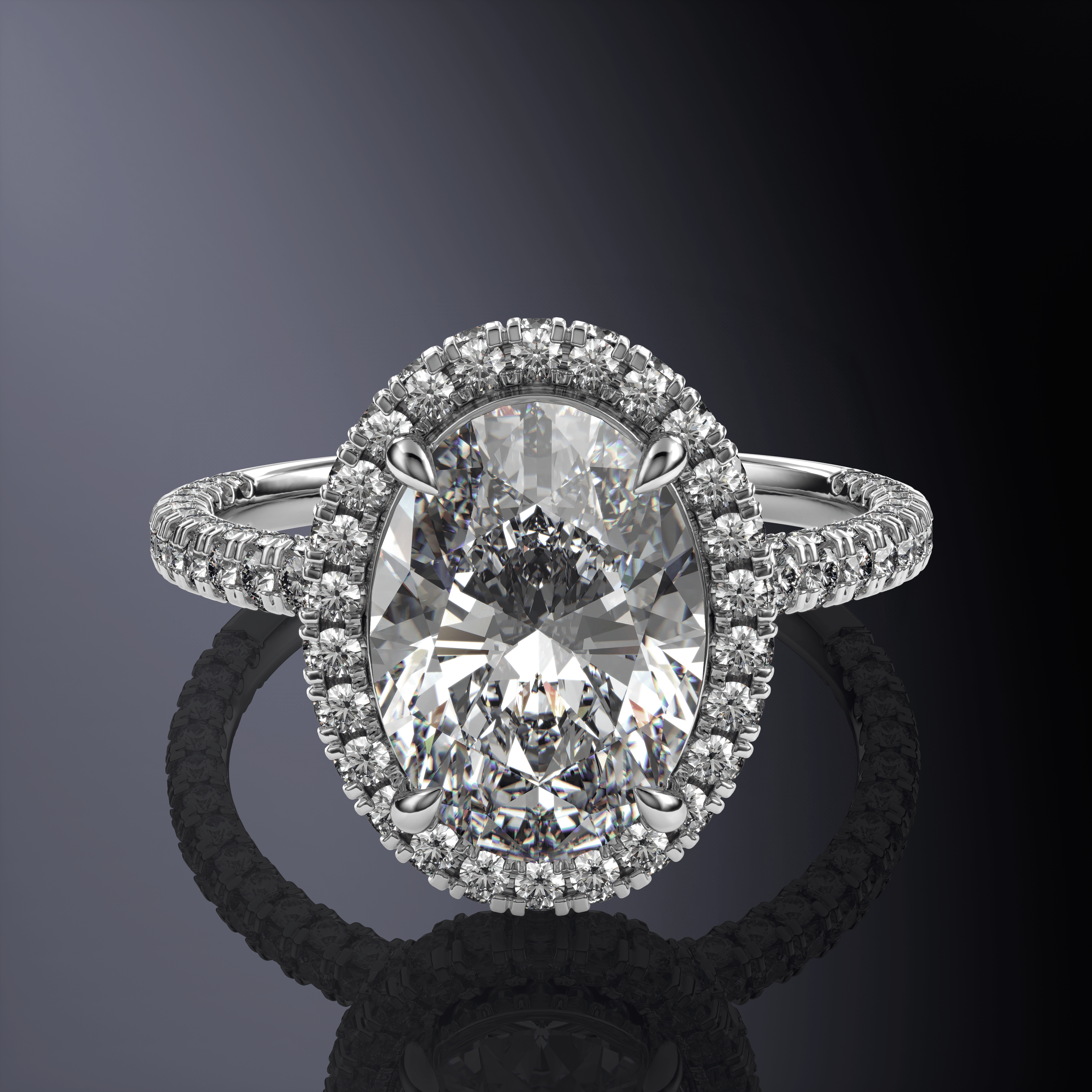 Oval Halo White Ring with Hidden Halo and Three-Sided Pavé Band
