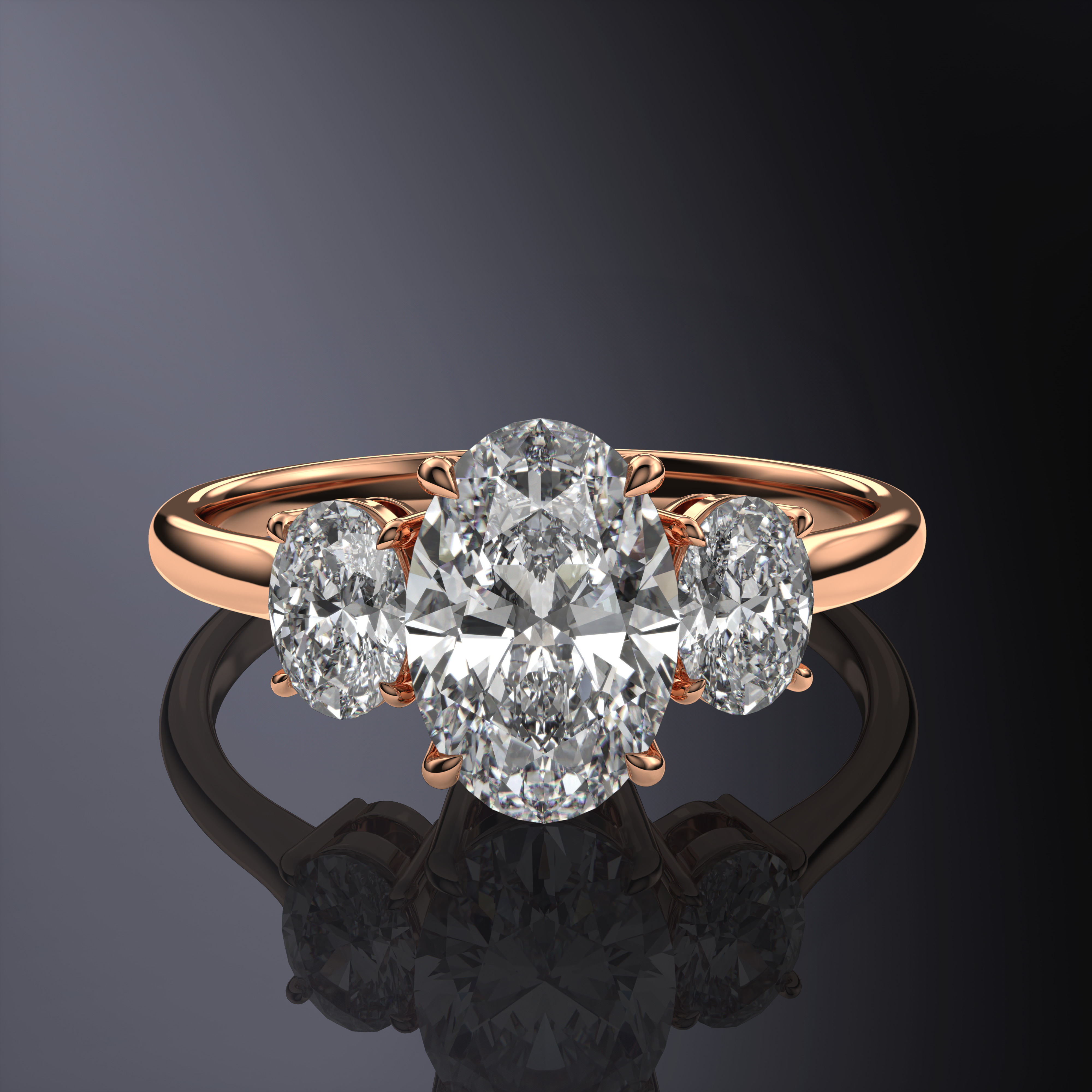 Astrea's Oval Trio engagement ring. A classic three-stone setting featuring a stunning Oval diamond with two smaller oval diamonds either side and delicately supported with four claw prongs.