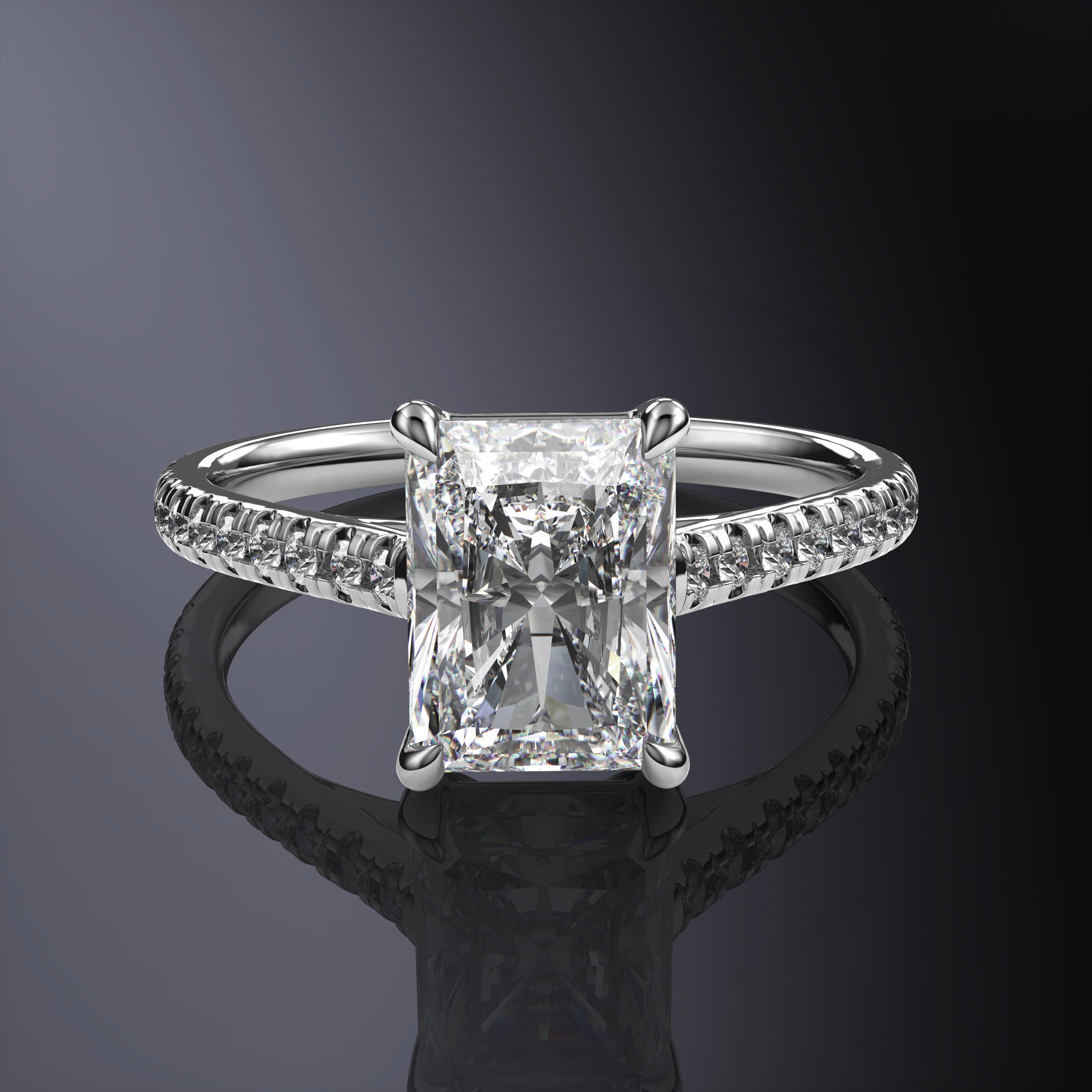 Astrea's solitaire engagement ring. A classic Basket setting featuring a beautiful radiant cut diamond delicately supported with four claw prongs and finished with a pave encrusted band.
